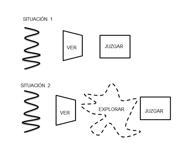 De Bono (2010) al explicarnos el gráfico comenta que en el primer caso, la persona ve la situación e inmediatamente la juzga. En el segundo, la persona ve la situación, después explora, y sólo entonces la juzga. Según el autor más del 90% de la información que manejamos la hemos adquirido con el primer modelo.