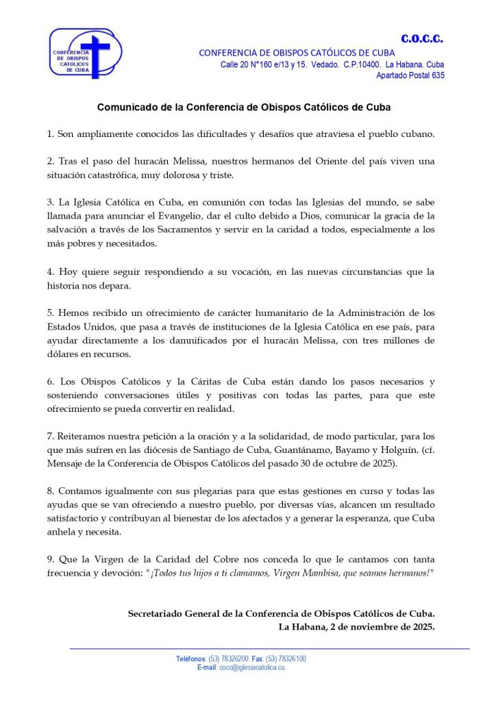 El Secretariado General de la Conferencia de Obispos Católicos de Cuba (COCC) hace un comunicado este 2 de noviembre de 2025 sobre el ofrecimiento de ayuda de carácter humanitario de la Administración de los Estados Unidos a través de la Iglesia católica.